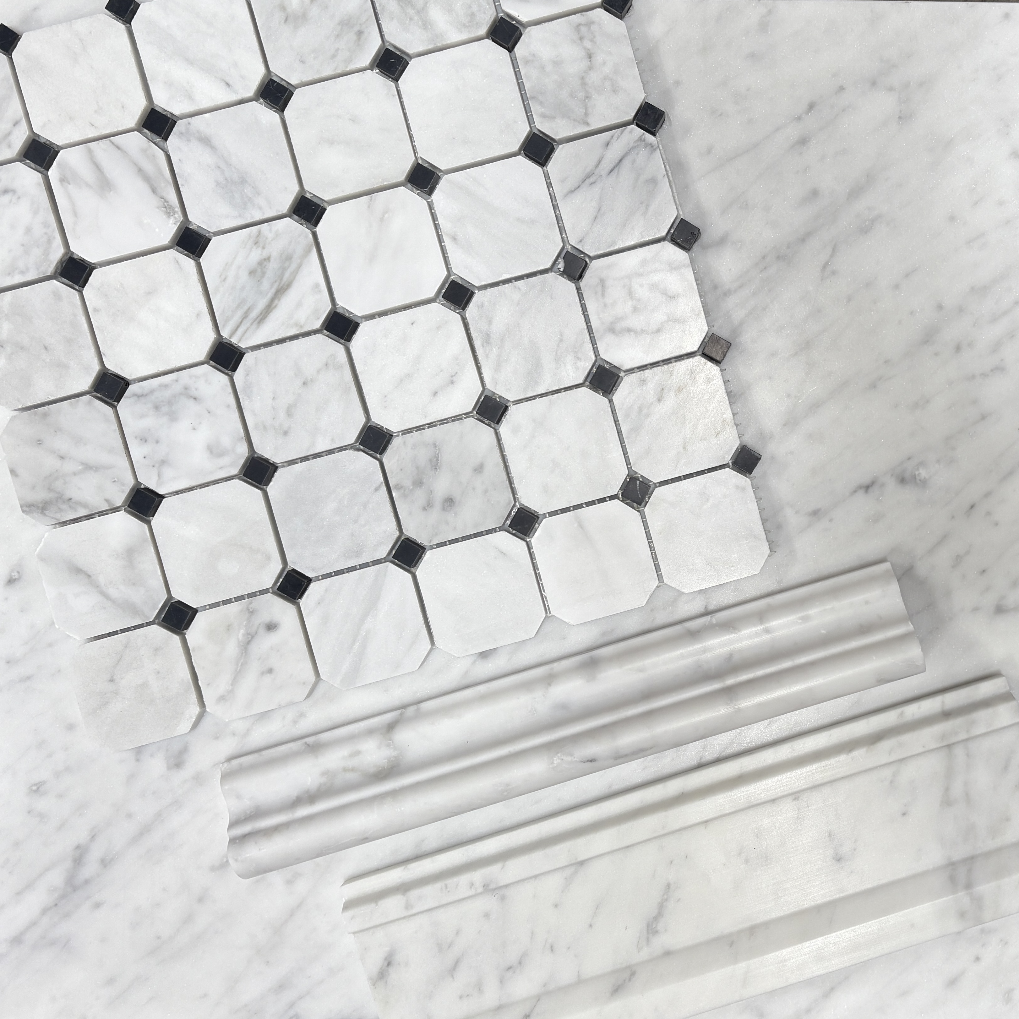 Beautiful sample board arrived with this new product. Bianco Carrara framed with Nero Marquina and then Thassos Hexagon in the center available online here.